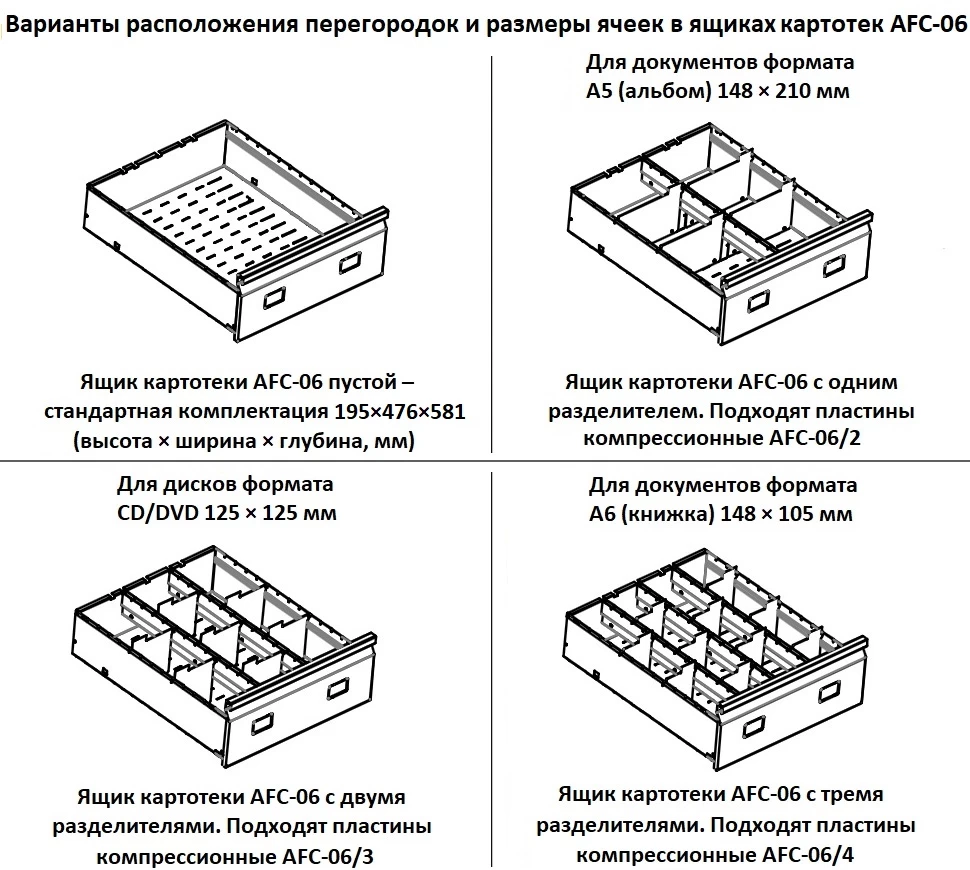 Картотека Практик AFC-06 состоит из шести ящиков, рассчитанных на хранение карточек А5 и А6, а также CD и DVD дисков. Для их размещения требуются дополнительные элементы: компрессионные пластины и продольные разделители (в комплект они не входят, их следует приобретать отдельно). Запираются все ящики одновременно посредством центрального ключевого замка ПРАКТИК, допускающего две тысячи комбинаций, среди достоинств которого следует отметить возможность смены цилиндра и прилагающийся мастер-ключ.