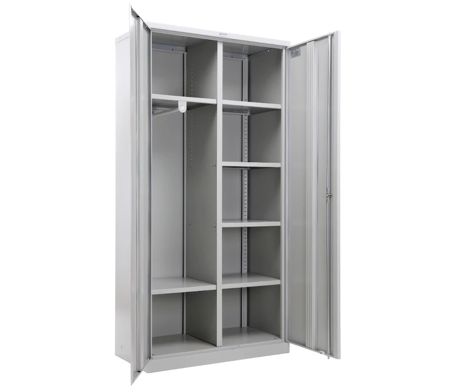 Шкаф состоит из двух секций, одна из которых предназначена для офисных нужд, то есть хранения бумаг, папок и канцелярских принадлежностей, а вторая – для верхней или рабочей одежды сотрудников, обуви, сумок, рюкзаков, зонтов, головных уборов.