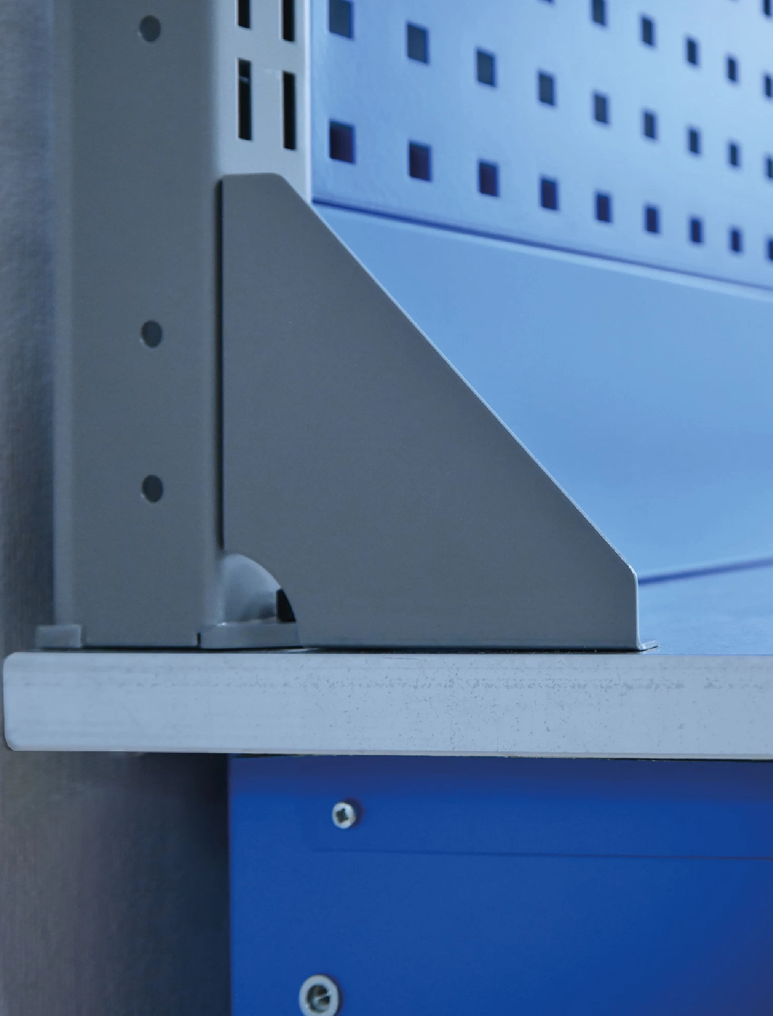 - Верстак состоит из прочной двухслойной столешницы, поддерживаемой двумя тумбами из профилированной холоднокатаной стали, и полки-стенки.